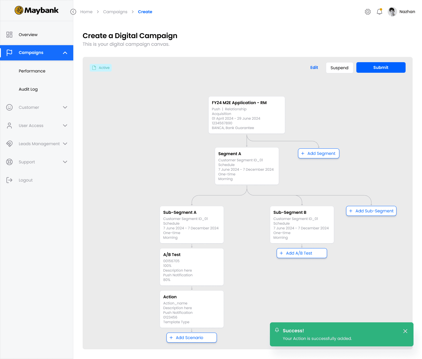 A unified engagement platform that enables bank employees to create, orchestrate, and optimize customer communications across all channels from a single interface with built-in personalization, approval workflows, A/B testing, and real-time analytics.